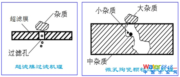 這是過濾截留原理示意圖,左圖表示超濾由固定孔徑機械截留,截留的雜質(zhì)在表面堆積,小于孔徑的雜質(zhì)會透過膜,液體的過濾路徑只有0.1微米。過濾精度越高則孔徑越小,但是推動力也越大,而節(jié)能微濾的過濾路徑是超濾路徑的數(shù)千倍,更多的截留雜質(zhì)不僅僅是在表面,而是在濾層和微孔之中,深長的過濾路徑彎彎曲曲,路徑的寬度忽大忽小,同時由于對顆粒表面的改性處理,不同的改性表面能夠?qū)Σ煌碾s質(zhì)具有吸附作用,從而使得較小的雜質(zhì)難以穿透濾層,初期截留的雜質(zhì)進一步增加了濾料的表面積,從而可以截留更多更小的雜質(zhì),稱之為以渣濾渣。