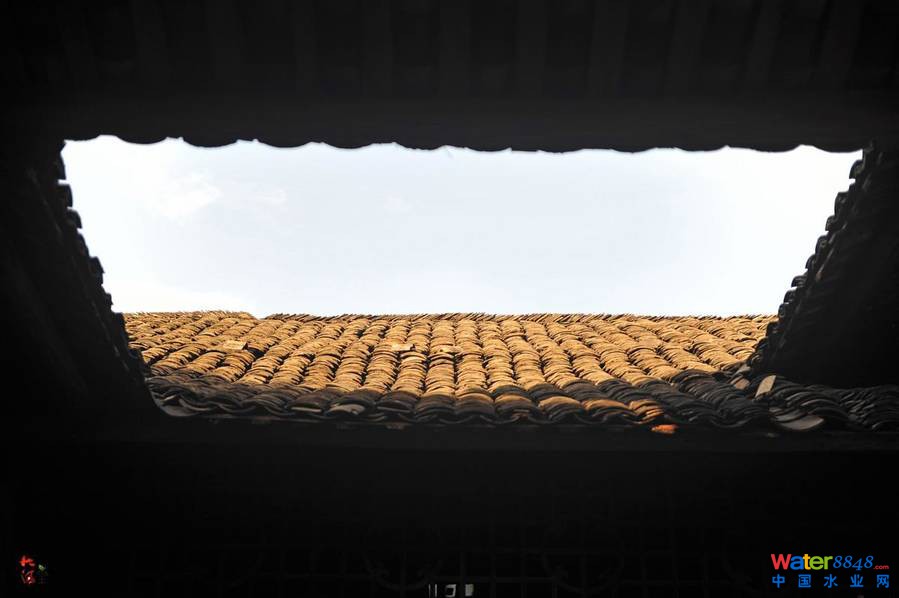 圖為天井上方的屋檐。四面的屋檐統(tǒng)一向著天井傾斜,便于雨水流到天井下的水池。