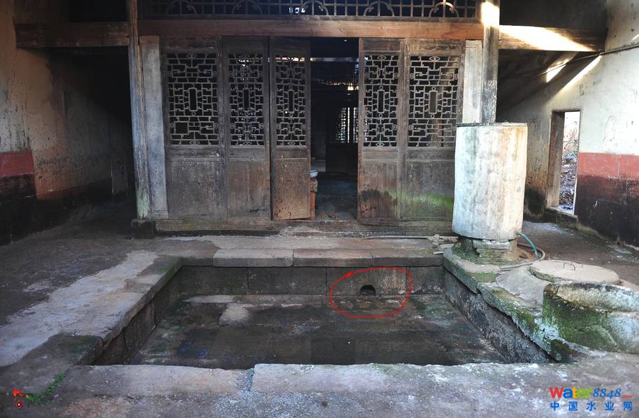 天井在大屋正廳兩側(cè)各有一個(gè),每個(gè)天井正下方都用石板砌有蓄水池。每逢下雨,雨水順著屋檐流進(jìn)蓄水池,水可以日常家用,也可以用來做消防用水。若遇大雨或連陰雨,水池水滿,則可以打開水池側(cè)面的排水洞(圖中紅圈處)讓水通過暗溝流出室外。