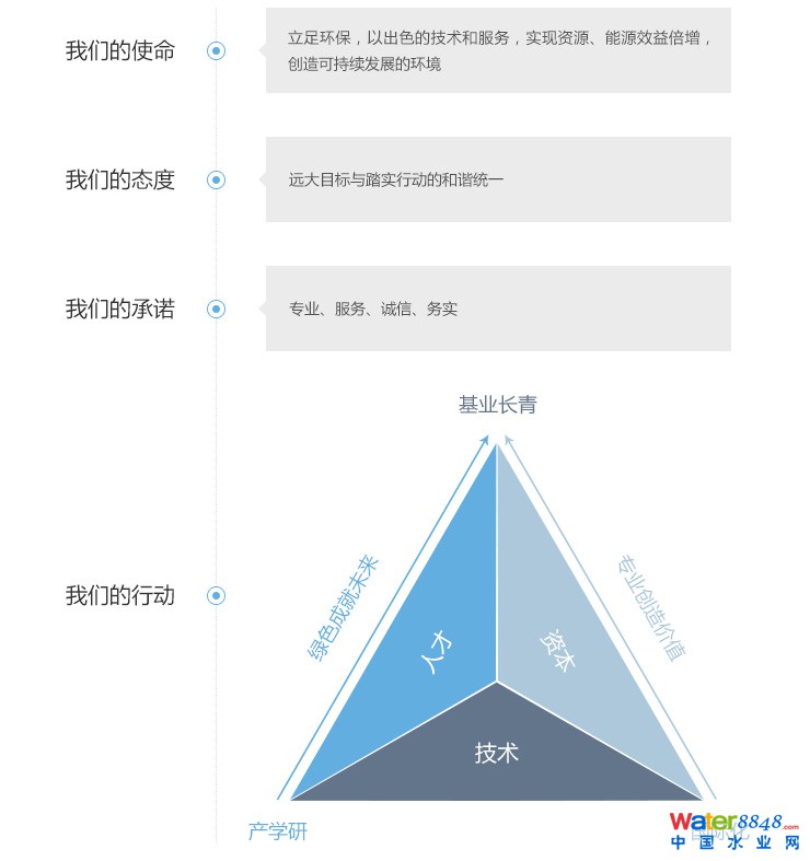 公司以“市場-技術-人才-資本”的良性互動為基礎,以持續(xù)的創(chuàng)新能力參與并引領競爭,以專業(yè)的工作精神為客戶創(chuàng)造價值,以特色和品牌為社會提供優(yōu)質服務,扎實地為我國環(huán)保事業(yè)做出貢獻,為創(chuàng)造更加綠色的未來而不懈奮斗。