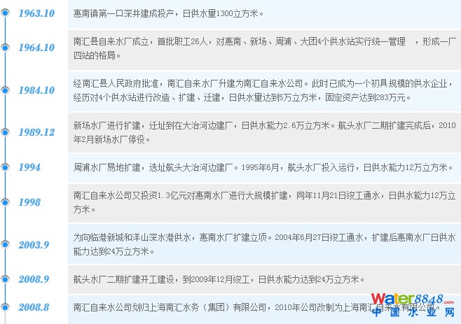 惠南水廠前身為惠南供水站,1983年在惠南鎮(zhèn)北門大街建成投產(chǎn)日供水能力1.5萬立方米的水廠,1984年10月更名為惠南水廠。1992年12月29日遷建三墩鎮(zhèn)二團(tuán)村大治河北岸的惠南新水廠投產(chǎn)。1998年,公司投入1.3億元對惠南水廠進(jìn)行擴(kuò)建,同年11月21日竣工通水,供水能力12萬立方米/日。2003年,為向臨港新城和洋山深水港供水惠南水廠再次擴(kuò)建立項,2004年6月24日竣工通水,供水能力24萬立方米/日。目前,惠南水廠供水范圍覆蓋惠南,宣橋,祝橋,大團(tuán),臨港新城等地區(qū),約300平方公里。
