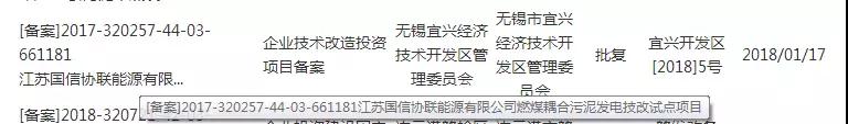 2018年1月,江蘇國信協(xié)聯(lián)能源有限公司燃煤耦合污泥發(fā)電技改試點項目完成“企業(yè)技術改造投資項目備案”宜興開發(fā)區(qū)[2018]5號
