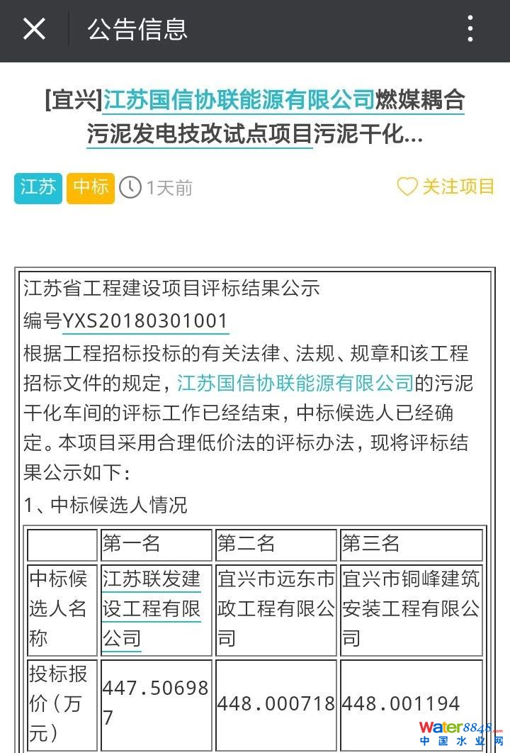 2018年4月,污泥干化車間評標工作結束,第一名為江蘇聯(lián)發(fā)建設工程有限公司,報價447.506987萬元