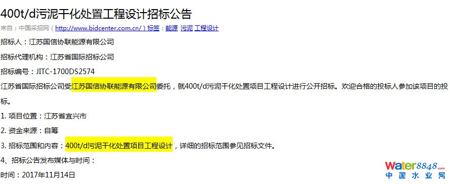 2017年底,江蘇國信協(xié)聯(lián)能源有限公司開展400t/d污泥干化處置工程項目設計公開招標