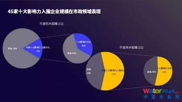 今年一共有近300家企業(yè)參與“2017年度(第十五屆)中國(guó)水業(yè)企業(yè)評(píng)選”活動(dòng),其中45家入圍十大影響力企業(yè),從最后匯總的統(tǒng)計(jì)結(jié)果整理及分析來看,在污水領(lǐng)域馬太效應(yīng)更加明顯。數(shù)據(jù)顯示, 45家十大影響力入圍企業(yè)占污水市場(chǎng)份額為57%,而十大影響力企業(yè)占比45家市場(chǎng)份額的54%。