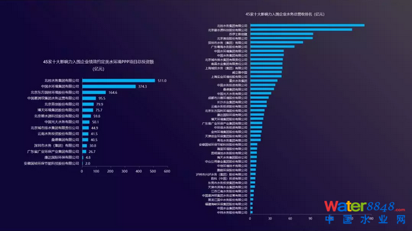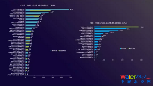 可以看到,水務(wù)總規(guī)模的排名中北控水務(wù)達(dá)到了4376萬噸/日。數(shù)據(jù)中我們還區(qū)分了特許經(jīng)營(yíng)項(xiàng)目類型和本地政府直接授予本地企業(yè)的屬地性專營(yíng)項(xiàng)目,右側(cè)可以看到45家十大影響力入圍企業(yè)的新增總規(guī)模排名。