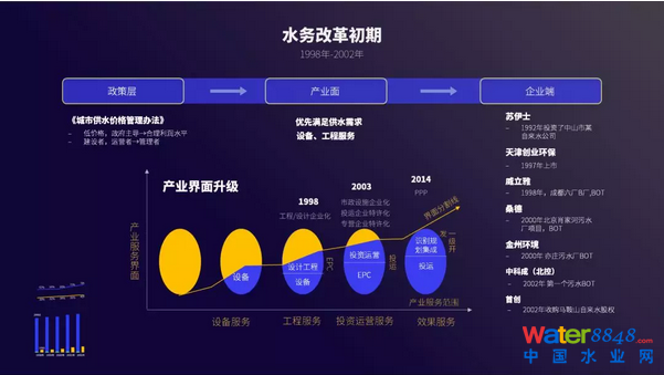 水務(wù)改革初期。在1998年到2002年這個(gè)階段,是水務(wù)行業(yè)剛剛起步的階段,很多企業(yè)在其中嶄露頭角。對(duì)應(yīng)我們之前關(guān)于水務(wù)領(lǐng)域的服務(wù)界面升級(jí)圖,可以看出,第一階段對(duì)應(yīng)的是:設(shè)備、工程服務(wù);第二階段對(duì)應(yīng)投資運(yùn)營(yíng)服務(wù);第三階段對(duì)應(yīng)效果服務(wù)。結(jié)合企業(yè)端典型事件來看,在第一階段,相關(guān)資料顯示,最早的水務(wù)市場(chǎng)化行為是蘇伊士在1992年進(jìn)行的中山市坦洲鎮(zhèn)建立中國(guó)第一家中外合資自來水公司的投資,也是當(dāng)時(shí)招商引資的一個(gè)標(biāo)志性項(xiàng)目(鏈接:→ 岳寶:蘇伊士在華治 “污”新布局)。1997年的時(shí)候,天津創(chuàng)業(yè)環(huán)保已經(jīng)完成上市,當(dāng)時(shí)主要還是以天津市的項(xiàng)目為主(鏈接→ 唐福生:天津創(chuàng)業(yè)環(huán)保在“十三五”期間的轉(zhuǎn)型探索之路)。威立雅1998年成都項(xiàng)目作為供水BOT項(xiàng)目,后來供水以股權(quán)的方式引資為主。(鏈接→ 回歸初心: 從成都六廠B廠與澳門自來水項(xiàng)目看中國(guó)水業(yè)改革)桑德在2000年的時(shí)候簽約了肖家河BOT污水處理廠(鏈接→ 桑德國(guó)際羅立洋:品質(zhì)驅(qū)動(dòng)——水業(yè)25年藍(lán)海探尋路經(jīng)驗(yàn)分享),跟這個(gè)項(xiàng)目同樣PK“誰是最早”的是金州在亦莊的BOT項(xiàng)目(鏈接→ 蔣超:三十年風(fēng)雨兼程,金州參與中國(guó)環(huán)境發(fā)展與改革之路),中科成(當(dāng)時(shí)還不屬于北控)2002年在西南簽約了第一個(gè)污水的BOT項(xiàng)目,首創(chuàng)在2002年收購(gòu)了馬鞍山自來水股權(quán)。