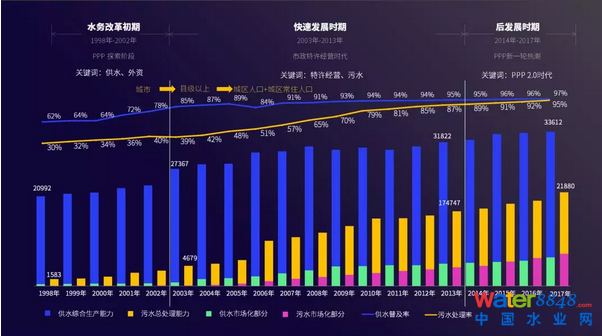 回顧水務(wù)改革二十年水大魚大的過程,我們把它分為三個(gè)階段,而且發(fā)現(xiàn)這三個(gè)階段跟PPP的三階段也基本相吻合。第一個(gè)階段(1998年到2002年),這個(gè)階段的關(guān)鍵詞是探索,這一時(shí)期更關(guān)注的是供水部分的市場(chǎng)化機(jī)會(huì),當(dāng)時(shí)市場(chǎng)也更青睞吸引外資,昨天王強(qiáng)有一篇文章將水務(wù)改革進(jìn)行到底,在業(yè)內(nèi)有很大影響;第二個(gè)階段(2003年到2013年),是以特許經(jīng)營(yíng)和污水為關(guān)鍵詞的快速發(fā)展期;第三階段(2014年到2017年),后發(fā)展階段也就是PPP 2.0時(shí)代,43號(hào)文打開了一個(gè)新的領(lǐng)域,但是前三年的發(fā)展也帶來了很多問題,規(guī)范之下未來方向仍需共同摸索。(鏈接:如何將水務(wù)改革進(jìn)行到底?)