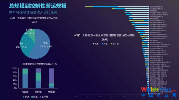 詳細(xì)看一下45家的業(yè)績(jī)規(guī)模比較(單位:億元),我們將水環(huán)境的運(yùn)營(yíng)收入進(jìn)行了估算,并且用“可控制性營(yíng)運(yùn)收入”作為統(tǒng)一標(biāo)尺進(jìn)行合計(jì)評(píng)估。45家企業(yè)在供水可控制性營(yíng)運(yùn)收入占比高達(dá)58%,其次是污水31%,最后是水環(huán)境11%。根據(jù)營(yíng)業(yè)收入中市政類、環(huán)境類所占比重程度分為:偏市政、偏環(huán)境和綜合性。對(duì)比發(fā)現(xiàn),這三類企業(yè)的可控制性營(yíng)運(yùn)收入各有偏重,后文還會(huì)對(duì)這三類企業(yè)分析它們的資產(chǎn)負(fù)債表,找出這類企業(yè)在新的商業(yè)模式下受到的影響。右側(cè)圖是45家企業(yè)可控制性營(yíng)運(yùn)收入的總排名。通過分析每一家企業(yè)的可控制性營(yíng)運(yùn)收入來源(包括水環(huán)境、供水以及污水)可以得出,45家企業(yè)在業(yè)務(wù)擴(kuò)張中不同領(lǐng)域的業(yè)務(wù)分配各有差異。