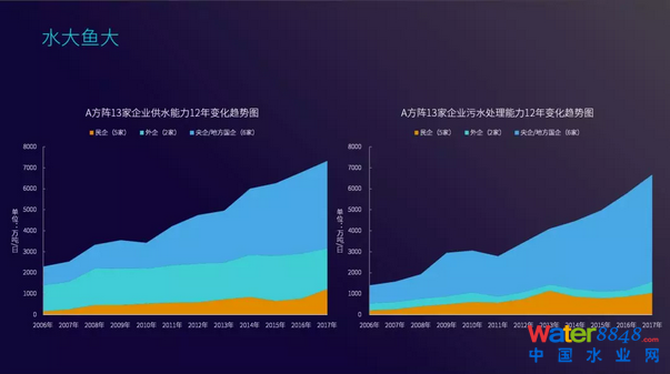 E20這些年一直在堅(jiān)持做一件很有價(jià)值的事情,就是持續(xù)地統(tǒng)計(jì)A方陣中13家企業(yè)的供水和污水能力的變化情況。如果去掉 “帝都雙雄”(北控、首創(chuàng)),總體來看,民企和國(guó)企在供水和污水市場(chǎng),基本上實(shí)力還是能相提并論的。(鏈接→ 楊光:北控水務(wù)生態(tài)理想與企業(yè)變革分享)尤其是A方陣中13家企業(yè)在污水處理能力中的份額分布,可以看出,民企的市場(chǎng)份額有所增加,但對(duì)比看來,國(guó)企份額的增長(zhǎng)來得更加猛烈。