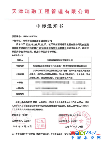 天津市瑞德賽恩水業(yè)有限公司2018年第一季度喜訊連連。在公司各級領(lǐng)導(dǎo)支持及投標(biāo)人員不懈努力下,瑞德賽恩水業(yè)公司憑借多年此類項(xiàng)目的運(yùn)營經(jīng)驗(yàn)和技術(shù),中標(biāo)東麗湖溫泉度假旅游區(qū)污水處理廠2018年度服務(wù)外包運(yùn)營項(xiàng)目!