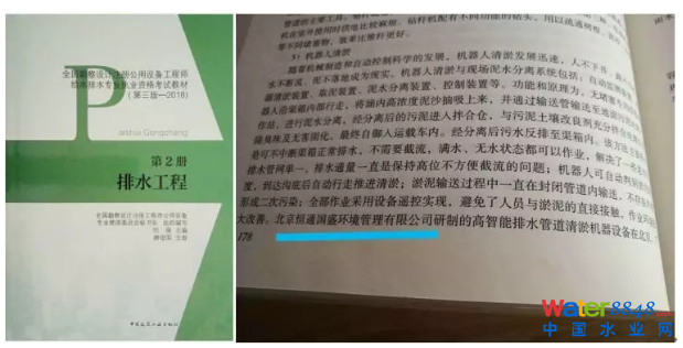 ——2018年5月最新出版的全國勘察設(shè)計(jì)注冊公用設(shè)備工程師給水排水專業(yè)執(zhí)業(yè)資格考試最新版教材(第三版-2018)《排水工程》,將北京恒通國盛環(huán)境管理有限公司(簡稱:恒通環(huán)境)最新的管道清淤機(jī)器人技術(shù)編寫進(jìn)了教材(P178-179)。該教材由全國勘察設(shè)計(jì)注冊工程師公用設(shè)備專業(yè)管理委員會秘書處組織編寫,由何強(qiáng)老師主編、赫俊國老師主審,并由中國建筑工業(yè)出版社出版,近日已經(jīng)登陸各地新華書店與京東、亞馬遜等電商平臺正式銷售。