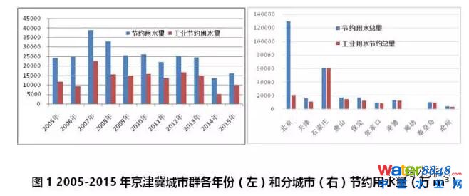 京津冀城市群水資源十分缺乏,但在用水效率提高的前提下,可以通過調整產業(yè)規(guī)劃與用水定額來實現(xiàn)用水總量的零增長。2005-2015年期間,2007年節(jié)約用水量達到高峰,之后逐年下降(見圖1左)。