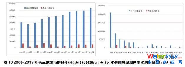 長三角城市群2005-2015年期間,污水處理總量持續(xù)增長,2015年是2005年的1.55倍。但再生水利用量并沒有顯著增長,再生水利用總量僅占污水處理總量的9%,各年份之間差異較大,總體呈現(xiàn)減少趨勢,2015年為2005年利用量的79%(見圖10左)。上海、南京和杭州的污水處理總量最大,僅上海市就占到全部總量的37%,三個城市總和占到全部總量的62.5%。南京市和蘇州市再生水利用量最大,分別占到全部總量的35%和23%。再生水利用較少的城市有上海、杭州、嘉興、紹興、泰州和臺州(見圖10右)。