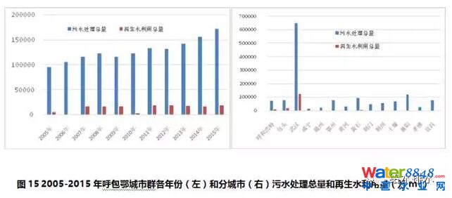呼包鄂城市群2005-2015年期間,污水處理總量持續(xù)增加,2015年是2005年的1.79倍;再生水利用占污水處理總量的10.5%,2015年是2005年的3.5倍,2011年再生水利用量增長幅度很小(見圖15左)。再生水利用主要來自三個城市,武漢市、包頭市和呼和浩特市,占城市群全部再生水利用總量的97%,武漢市更是占到了81%,黃石和十堰市有很小比例的再生水利用(見圖15右)。