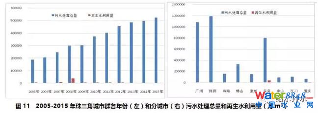 珠三角城市群2005-2015年期間,污水處理總量持續(xù)增加,但再生水利用量并沒有與之同比例增加,再生水利用總量占污水處理總量的占比僅為1.6%(見圖11左)。這可能是由于該地區(qū)雨水豐沛,污水處理后的水作為生態(tài)用水更為經濟[1]。2008年珠三角城市群再生水利用量達到峰值,且主要來自東莞市和肇慶市(見圖11右)。