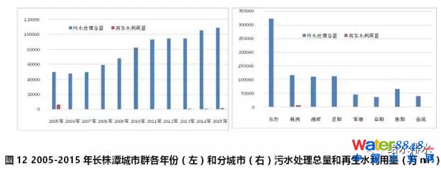 長株潭城市群2005-2015年期間,污水處理總量持續(xù)增加,2015年污水處理總量達到10億m³,是2005年的2.2倍。2002-2008年期間廢水排放總量基本與經濟增長水平保持同步遞增趨勢,且廢水排放生產率快速提高,總體環(huán)境污染負荷較高。盡管長株潭城市群2005年至2010年期間工業(yè)廢水排放達標率持續(xù)改善,但區(qū)域上中下游城市污水集中處理率分別為15.3%、31.8%、49.4%,水污染問題嚴重。2009年是長株潭城市群污水處理量提升的一個關鍵年份,2009年以后污水處理量大幅度提升,這可以有效改善區(qū)域生態(tài)環(huán)境資源承載能力。但再生水利用量沒有同比例增加,其用量僅為污水處理總量的1.2%(見圖12左)。除長沙和株洲外,湘潭、岳陽、常德、益陽、衡陽和婁底這六個城市均無再生水生產和利用行為(見圖12右)。研究表明,長株潭城市群2030年城市化率達到90%、第二產業(yè)和第三產業(yè)持續(xù)增長的態(tài)勢下,只有將污水處理率提高到100%、污水回用率提高到35%的條件下,才不會產生水資源供需缺口狀況[7]。提升城市群再生水利用率是實現(xiàn)水資源供需平衡的一個重要措施。
