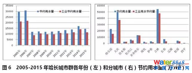 哈長城市群2005-2015年期間,2005年和2006年節(jié)約用水量達到高峰后,一直維持在每年1.5億噸左右(見圖6左)。節(jié)約用水總量前四位依次是吉林、大慶、哈爾濱和齊齊哈爾,占全部節(jié)約用水量的84.7%;工業(yè)用水節(jié)約總量占比為77.6%(見圖6右)。在節(jié)約用水數(shù)據統(tǒng)計方面,只有吉林省的遼源市和佳木斯市數(shù)據缺失嚴重,其他城市數(shù)據完整性較好。