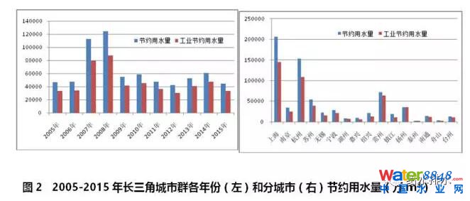 長三角城市群2005-2015年期間,2007年和2008年節(jié)約用水達到高峰后,節(jié)約用水量呈明顯下滑趨勢。工業(yè)用水節(jié)約總量占節(jié)約用水總量的73.8%(見圖2左)。整個城市群節(jié)約用水數(shù)據統(tǒng)計工作非常好,僅泰州市缺失2012年到2015年的節(jié)約用水數(shù)據。節(jié)約用水量前三位的城市分別是上海、杭州和常州,占到城市群節(jié)水總量的62%(見圖2右)。