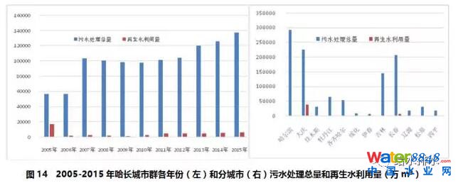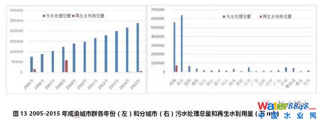 成渝城市群2005-2015年期間,污水處理總量持續(xù)增加,2015年污水處理總量達到13.8億噸,是2005年3.12倍。但再生水利用量沒有增加,反而比2005年降低了60%?傮w上,再生水利用總量僅為污水處理總量的5.2%(見圖13左)。再生水利用量最多的城市是成都市,達到7.39億m³,主要來自2005-2008年期間,2008年當年利用量達到58150萬m³,但2009年僅為35萬m³,2013年以后再生水利用量為零。重慶市自2006年啟動再生水利用以來逐年增加,從2006年的118萬m³,增長到2015年的854萬m³,增長了7.23倍。沒有統(tǒng)計或再生利用較少(見圖13右)。