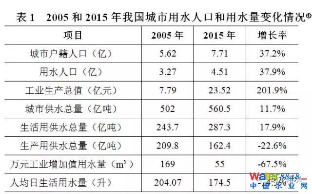 2005~2015年期間,城市戶籍人口、用水人口數(shù)量和工業(yè)生產總值大幅度提高,城市供水總量僅增長了11.7%。同期,萬元工業(yè)增加值用水量下降了67.5%,人均日生活用水量降低了14.5%,生產用供水總量下降了22.6%,生活用供水總量僅增長了17.9%(見表1)。