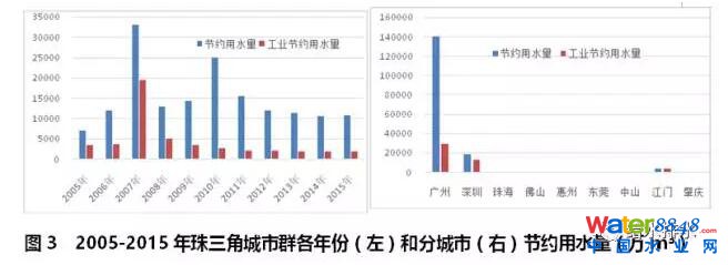 珠三角城市群2005-2015年期間,只有廣州市有完整的節(jié)約用水數(shù)據,深圳、東莞、江門和肇慶2010年前有個別年份的節(jié)約用水數(shù)據,珠海、佛山、惠州和中山則完全沒有進行統(tǒng)計。2008年整個城市群節(jié)約用水量達到高峰,之后逐年下滑(見圖3左)。工業(yè)節(jié)約用水比重占全部節(jié)約用水總量的29.2%,廣州市為21.4%(見圖3右)。