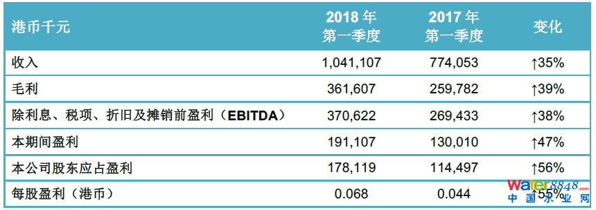 2018 年5月10日,中國光大水務(wù)有限公司(以下簡稱“光大水務(wù)”)一家以水環(huán)境綜合治理業(yè)務(wù)為主業(yè)的環(huán)保集團,今天宣布其截至2018 年3 月31 日止第一季度(“2018 年第一季度”或“回顧期內(nèi)”)未經(jīng)審核之業(yè)績。