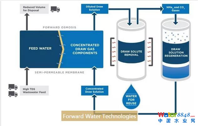 為解決汲取液的技術(shù)難點(diǎn),該公司采用兩相汲取液,低溫時(shí)汲取液滲透壓可達(dá)21 MPa,作為正滲透驅(qū)動(dòng)力。后利用廢熱加熱使其氣化,可轉(zhuǎn)換鹽變成氣體二氧化碳和TMA(三甲胺),實(shí)現(xiàn)汲取液和清水分離,同時(shí)氣化的汲取液進(jìn)入再生罐,循環(huán)利用。 此前,F(xiàn)orward Water在加拿大安大略省密西沙加市建立一個(gè)小型試點(diǎn)項(xiàng)目,來驗(yàn)證在工業(yè)應(yīng)用上的可行性。2017年11月,公司獲得了來自加拿大聯(lián)邦政府和石油重鎮(zhèn)阿爾伯塔省100萬加元的資助,用于加快其水處理技術(shù)的商業(yè)化。
