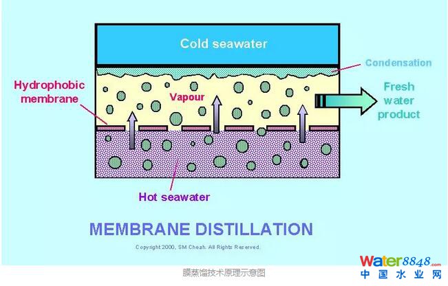 優(yōu)勢:膜蒸餾技術(shù)理論上有100%截留率;操作溫度低、可利用廢熱;操作壓力低;設(shè)備投資少等,幾乎不存在膜污染問題,使用壽命長。常規(guī)海水脫鹽系統(tǒng)的回收率小于40%-50%,通過這一耦合過程,可以處理反滲透海水淡化后的高含鹽水,可將高含鹽水排放量減少到30%,實(shí)現(xiàn)水和能量資源的高效利用。