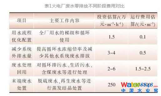 由表1可見,火電廠廢水零排放不是通過簡單一種技術(shù)或工藝就可以實現(xiàn),而應(yīng)該是多種技術(shù)工藝的組合.且其實現(xiàn)應(yīng)該根據(jù)各廠的具體情況分步驟實施。隨著廢水零排放工作的逐步進(jìn)行,其投資和運行費用越來越高,但節(jié)水效果卻越來越小。由于嚴(yán)格意義的廢水零排放實施難度大、成本高,目前國內(nèi)只有極少數(shù)電廠建設(shè)了嚴(yán)格意義上的全廠廢水零排放系統(tǒng)。