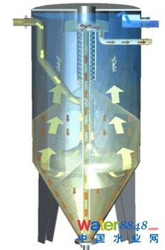 2、布水器采用幅式和環(huán)形布水綜合設(shè)計,布水均勻,布水器頂部錐形設(shè)計,避免出現(xiàn)死角,濾料利用率高,水頭損失小,可避免上向流水流短路。