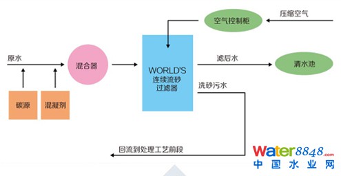 連續(xù)流砂過濾器可用于自來水的地表水和地下水的直接接觸過濾,從而取消傳統(tǒng)三段式處理工藝中的混凝池;在常規(guī)二級生化處理中,連續(xù)流砂過濾器可直接設(shè)在二沉池后,對二沉池出水進(jìn)行深度處理,無須專設(shè)混凝池、澄清池等工藝設(shè)施?芍苯釉谶M(jìn)水管線或渠道投加混凝劑,濾料在過濾器內(nèi)的循環(huán)運動可起到攪拌作用。與常規(guī)三段式過濾相比較,連續(xù)流砂過濾器工藝使工程量和投資均顯著降低,運行維護(hù)費用低,避免了傳統(tǒng)三段式處理工藝設(shè)施繁多、工藝復(fù)雜、投資和運行費用高等缺點。
