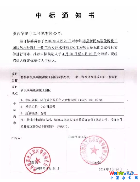 2018年4月24日,陜西華陸化工環(huán)保有限公司成功中標(biāo)彬縣新民高端能源化工園區(qū)污水處理廠一期工程及尾水排放EPC工程項(xiàng)目(以下簡稱:中標(biāo)項(xiàng)目),中標(biāo)金額為6275.1萬元。