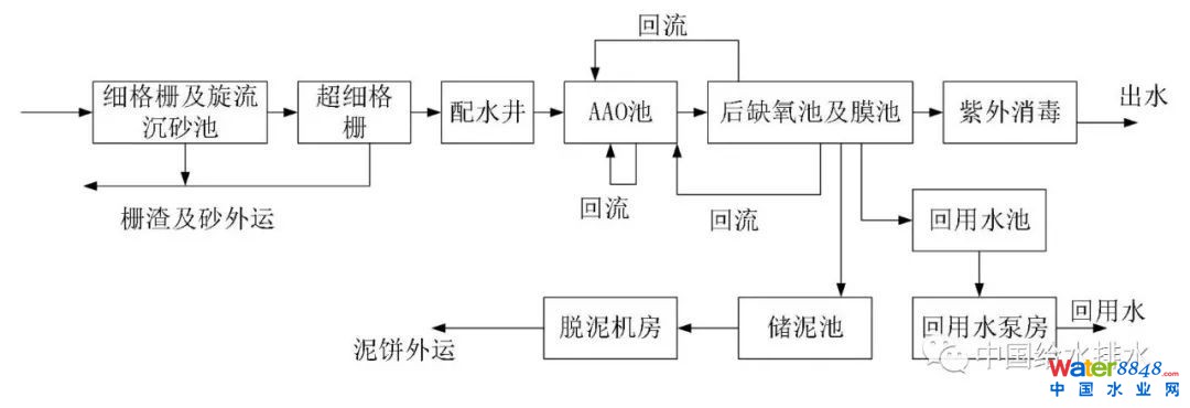該廠采用厭氧/缺氧/好氧/缺氧(AAOA)-MBR工藝,處理規(guī)模為10×104m3/d,現(xiàn)實(shí)際處理量為(6~8)×104m3/d。工藝流程如圖1所示。