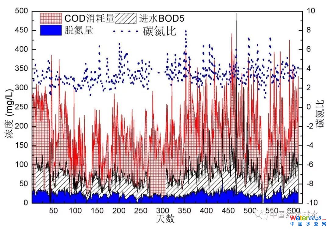 雖然進(jìn)水BOD5濃度不高,但消耗的COD濃度還是遠(yuǎn)大于進(jìn)水BOD5濃度(紅色方格構(gòu)成的區(qū)域?yàn)閮烧卟钪担,另外最終進(jìn)水COD基本都被降解,由此可見(jiàn)進(jìn)水中的COD主要為可降解但不易降解大分子有機(jī)物。