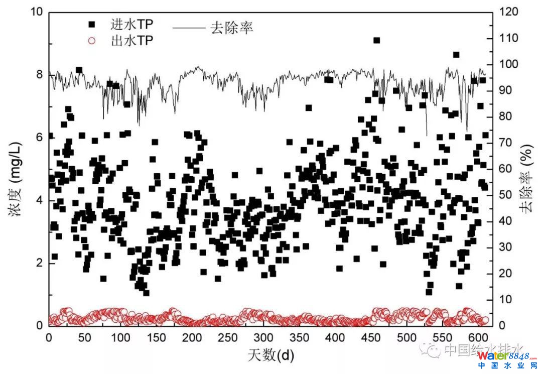該系統(tǒng)主要是通過(guò)化學(xué)除磷,除磷藥劑為聚合氯化鋁(PAC)。盡管系統(tǒng)的進(jìn)水TP濃度波動(dòng)較大,但出水TP濃度基本穩(wěn)定在0.5mg/L以下,平均為0.25mg/L。由此可見(jiàn),通過(guò)化學(xué)方式除磷基本不受超高污泥濃度的影響,但生物除磷能力是否收到了影響尚需進(jìn)一步研究。
