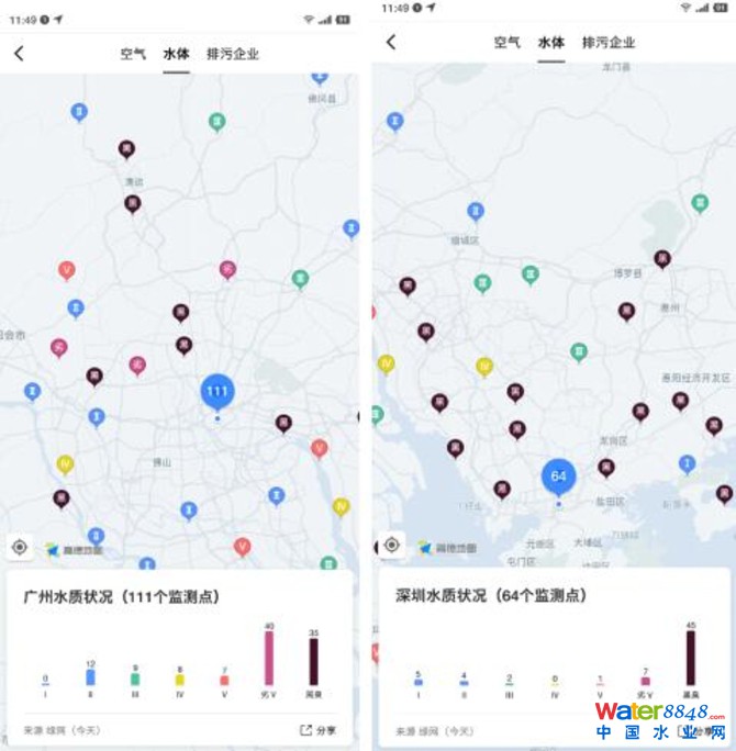 六五環(huán)境日,環(huán)境保護(hù)部宣傳教育中心聯(lián)合阿里巴巴公益基金會、高德地圖共同推出環(huán)境地圖。該環(huán)境地圖不僅可在線查看全國城市的空氣質(zhì)量、污染源等環(huán)境信息,還可以一目了然地查看全國各城市水質(zhì)情況。地圖中顯示,西安、杭州、昆明等城市水質(zhì)情況相對較好,水質(zhì)監(jiān)測點(diǎn)的黑臭水分布幾乎為0;北上廣深一線城市黑臭水問題相對嚴(yán)重,深圳水質(zhì)監(jiān)測點(diǎn)的黑臭水占比達(dá)到70%以上。