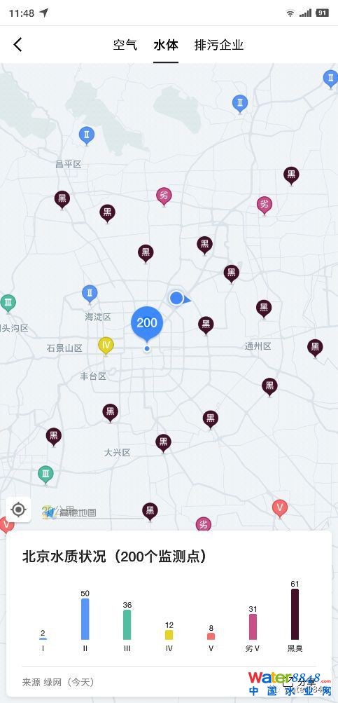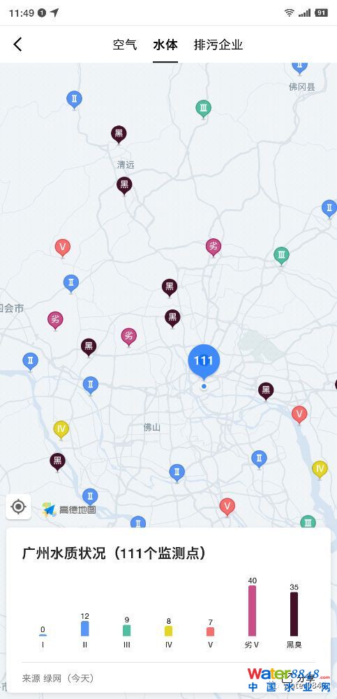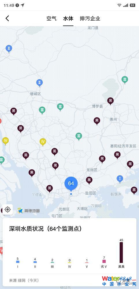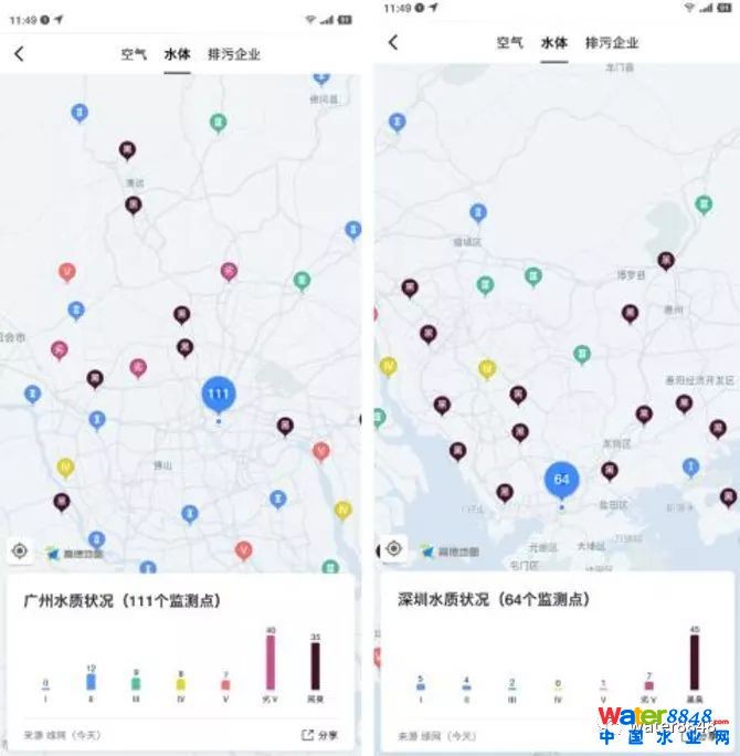 六五環(huán)境日,環(huán)境保護(hù)部宣傳教育中心聯(lián)合阿里巴巴公益基金會(huì)、高德地圖共同推出環(huán)境地圖。該環(huán)境地圖不僅可在線查看全國城市的空氣質(zhì)量、污染源等環(huán)境信息,還可以一目了然地查看全國各城市水質(zhì)情況。地圖中顯示,西安、杭州、昆明等城市水質(zhì)情況相對(duì)較好,水質(zhì)監(jiān)測(cè)點(diǎn)的黑臭水分布幾乎為0;北上廣深一線城市黑臭水問題相對(duì)嚴(yán)重,深圳水質(zhì)監(jiān)測(cè)點(diǎn)的黑臭水占比達(dá)到70%以上。