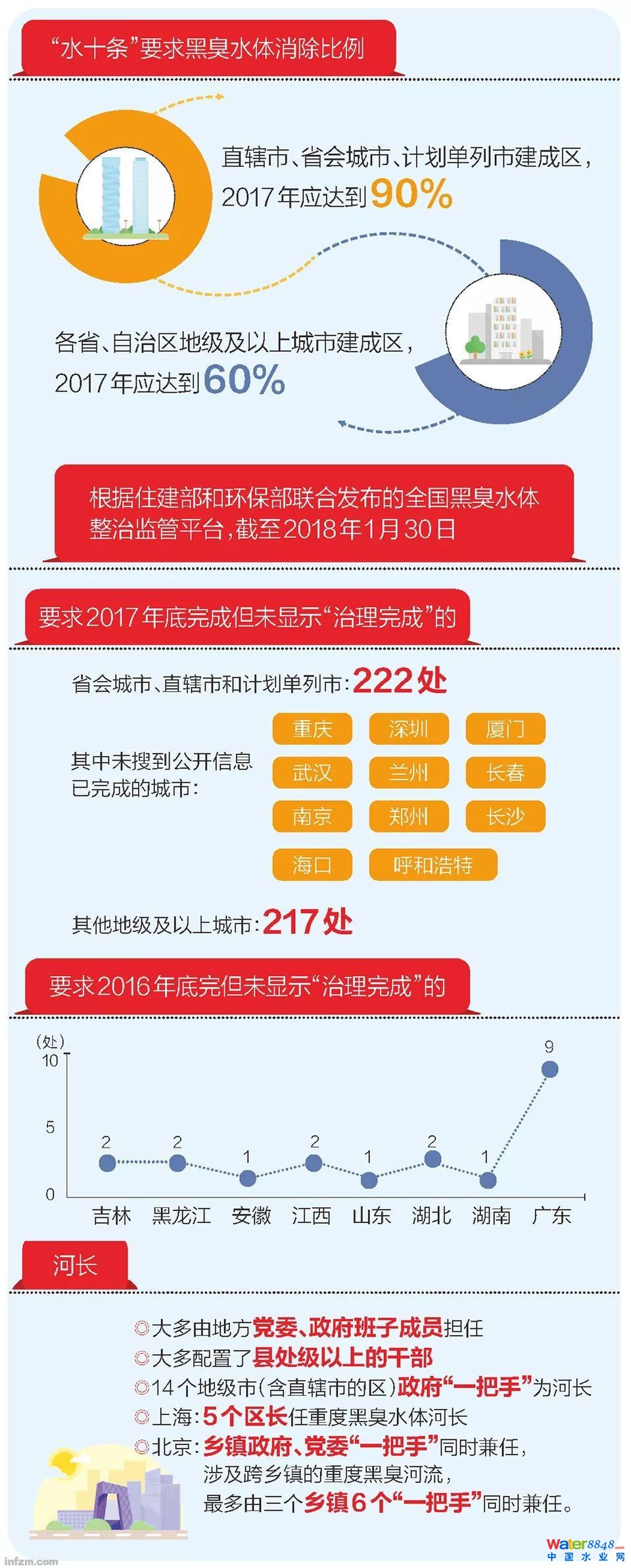 - 在住建部和環(huán)保部聯(lián)合發(fā)布的全國黑臭水體整治監(jiān)管平臺(tái)上,截至2018年1月30日,全國要求在2017年消除的黑臭水中,顯示“尚在治理中”的有789個(gè),“方案制定中”的有190個(gè),未完成率接近一半。