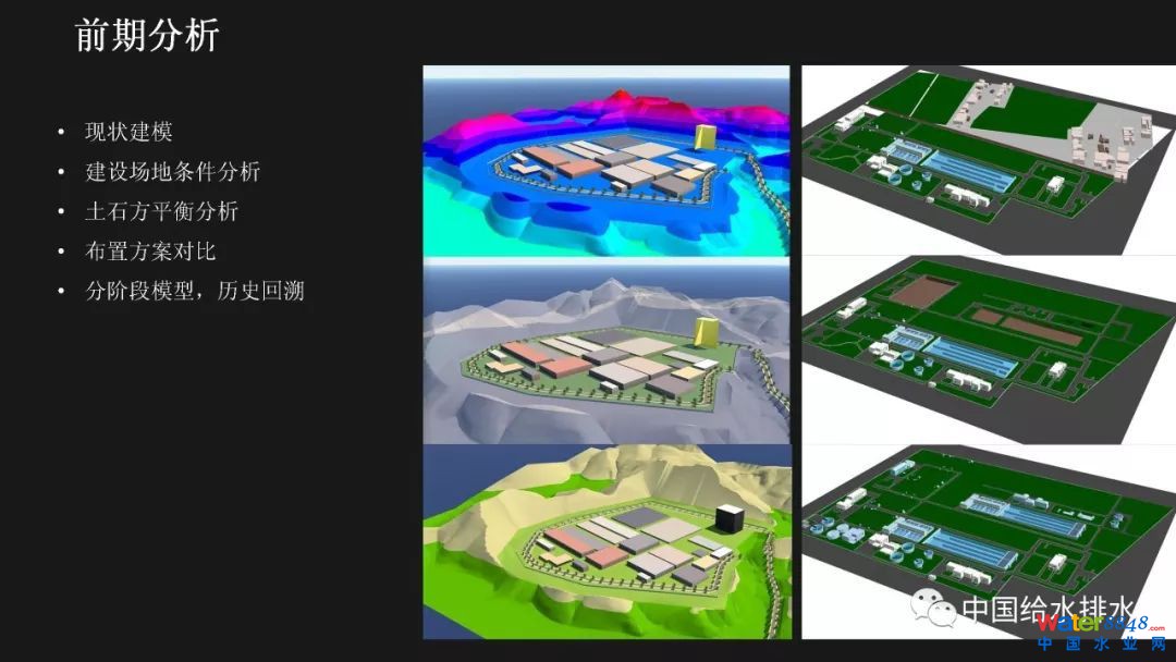 項目前期策劃階段對整個建筑工程項目的影響是很大的。前期策劃做得好,隨后進行的設計、施工就會進展順利;而前期策劃做得不好,將會對后續(xù)各個工程階段造成不良的影響。項目的前期應用BIM,使項目所有利益相關(guān)者能夠早一點在一起參與項目的前期策劃,讓每個參與方都可以及早發(fā)現(xiàn)各種問題并做好協(xié)調(diào)。BIM在項目前期可以進行的工作有很多,包括:現(xiàn)狀建模與模型維護、場地分析、土石方平衡計算、布置方案必選等,甚至于如右邊這張圖所示的,對于廠區(qū)現(xiàn)狀拆遷、施工平整、建成后的各個階段都可以整合在一個模型里,模型沿時間跨度上進行了整合。