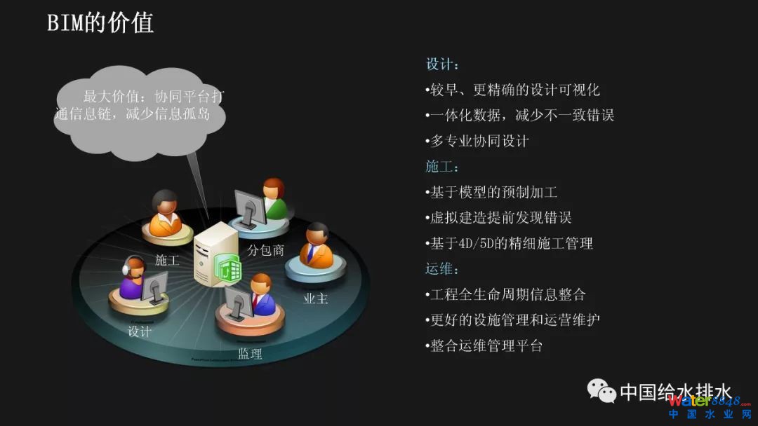 前面提到,對于智慧水務來說,是要消除“孤島應用”。BIM的最大價值也在于通過信息技術(shù),把業(yè)主、設計、施工、監(jiān)理、分包商等整合到一個協(xié)同平臺上來,降低信息不暢帶來的額外支出和成本,減少信息孤島。