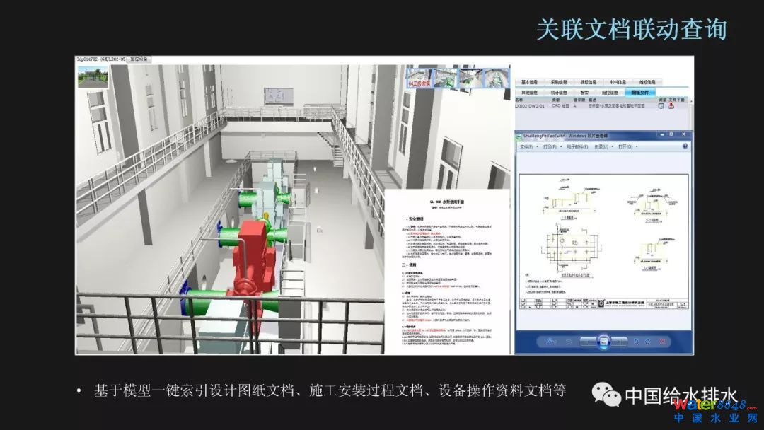 除了基本的設備信息之外,還可以將設計、施工、安裝過程中相關(guān)技術(shù)文檔與工程實體關(guān)聯(lián),讓相關(guān)的信息和資料都通過三維模型建立聯(lián)系,避免工程資料的分散存儲、查找不便。如圖對某臺水泵可一鍵索引其水泵基礎設計圖、水泵安裝技術(shù)文檔等。從某種程度上講,這才是達成了將工程所有信息集成在一起的目的。