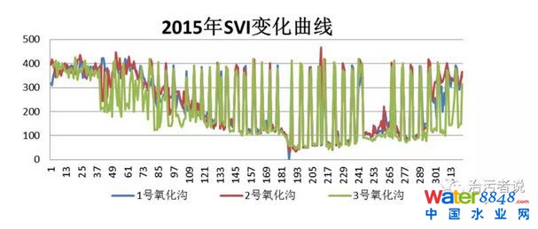 這個(gè)是某個(gè)污水廠的SVI變化曲線,可以看到冬季,12月到2月是SVI出現(xiàn)高值的區(qū)域,也正是反映了這種SVI的變化情況。
