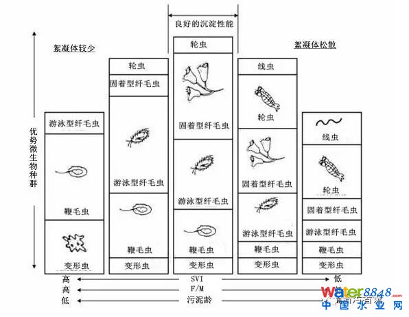 活性污泥中的微生物組成是隨著SRT的推進(jìn)而變化的,從下圖可以看到,污泥齡初期,主要以細(xì)菌和低等的原生動(dòng)物:鞭毛蟲,阿米巴蟲等組成,培養(yǎng)的后期以游泳型的鐘蟲為主,這些低等的微生物之間處于一個(gè)對(duì)底層細(xì)菌快速捕食的階段,沒有形成良好的絮凝體,污泥的沉降性能比較差,SVI值較高。進(jìn)入活性污泥絮凝體形成以后,污泥呈現(xiàn)了良好的沉降性,微生物也以固著型鐘蟲為主,此時(shí)的活性污泥SVI適中,呈最佳的運(yùn)行狀態(tài)。污泥齡持續(xù)加長以后,活性污泥中的主要微生物也發(fā)生了變化,主要以輪蟲,線蟲為主,這些復(fù)雜的高等級(jí)的后生動(dòng)物對(duì)活性污泥的絮凝體造成了一定的破壞,同時(shí)活性污泥絮凝體周邊的EPS(多糖物質(zhì))也被消耗,這些活性污泥中的活性有機(jī)質(zhì)被消耗,會(huì)增加活性污泥絮凝體的比重,提高其的沉降性能,使活性污泥沉降比下降,SVI也隨著下降;同時(shí)還有就是在一個(gè)系統(tǒng)內(nèi)SRT越長,污泥濃度也會(huì)越高,污泥濃度在SVI中處于分母的位置,會(huì)造成SVI值下降。