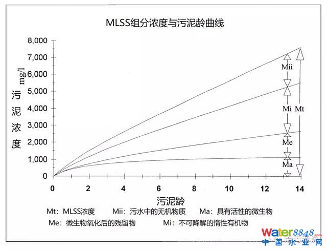 這張圖反映了隨著SRT的增加,污泥濃度隨著增加,活性污泥的四種組分之間的變化,可以看到不可降解的有機(jī)物Mi和無機(jī)固體Mii部分占了很大的比例,因此造成活性污泥隨著污泥齡SRT的增加,污泥比重增加,也就導(dǎo)致了活性污泥沉降性能較好,SVI變低的情況。