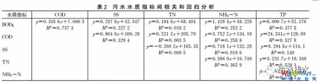 本研究針對污水處理廠2016年全年平均進水水質(zhì)指標COD、BOD5、SS、TN、NH3-N和TP,采用最小二乘法對數(shù)據(jù)進行回歸分析,建立相應(yīng)回歸方程,得到各污染指標之間的相關(guān)關(guān)系。各指標間的回歸方程及相關(guān)系數(shù)(R2)如表2所示。