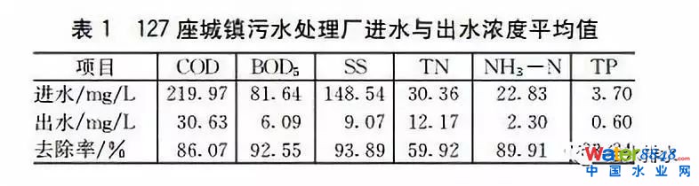 本研究共涉及127座污水處理廠,平均進水COD 219.97 mg/L, BOD581.64 mg/L,SS 148.54 mg/L, TN為30.36 mg/L,NH3-N為22.83 mg/L,TP 3.7 mg/L,出水濃度均低于一級A標準,其中SS去除率最高,TN去除率最低,僅為59.92%。BOD5/COD平均值為0.36,BOD5/TN平均值為2.66,詳見表1。