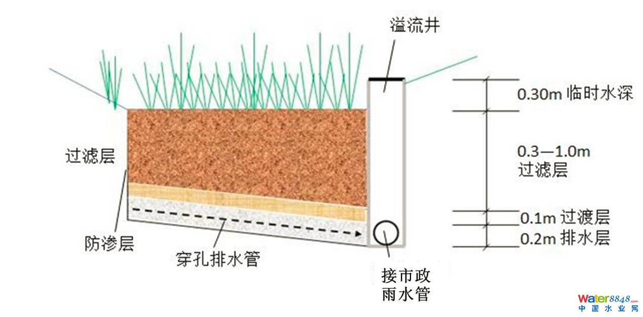 過濾層不可或缺,主要作用包括去除污染物和為植物提供營養(yǎng)等。植物能夠加強(qiáng)過濾,使過濾層不板結(jié),還能夠去除部分污染物。過濾層應(yīng)有足夠的深度使植物正常生長,深度一般為600—1000mm,在深度控制區(qū),最小深度可取300mm。如果植物中含有深根植物,則過濾層深度應(yīng)大于800mm,以免生物滯留池被植物根破壞。