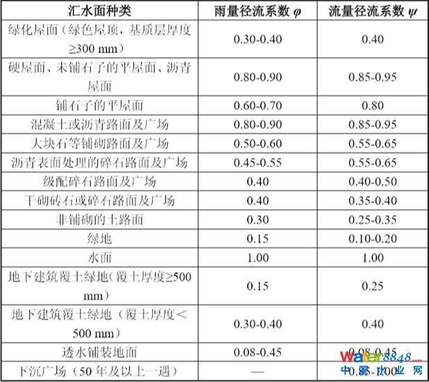 集水區(qū)綜合雨量徑流系數(shù)的計算按各地塊滲透性質(zhì)進(jìn)行面積加權(quán),具體參照表3-2。