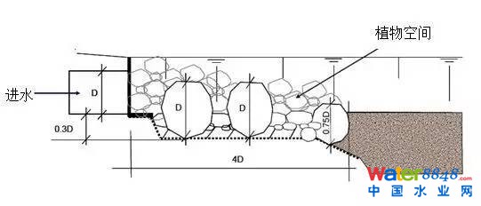 生物滯留池進(jìn)水方式多為集中進(jìn)水,須設(shè)計防沖刷保護(hù)措施。采用石塊可降低流速并分散水流,應(yīng)在集中進(jìn)水口布置石塊,石塊大小和位置可按下圖3-3所示。